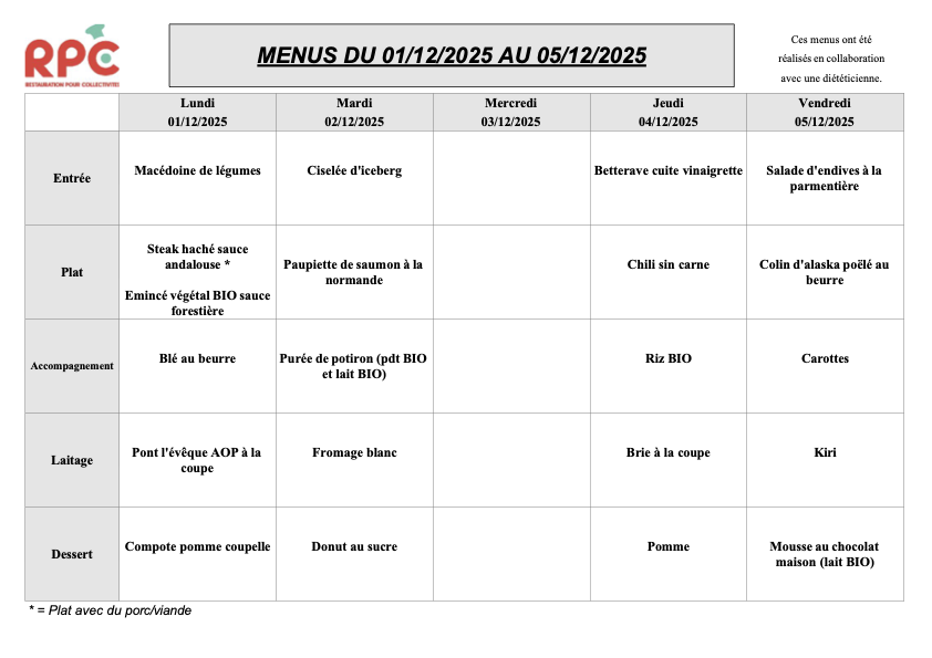 Menus du 24/11 au 05/12/25
